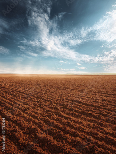 Fototapeta premium A vast plowed field under a cloudy blue sky.