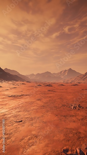 Naklejka premium A vast, red desert landscape on Mars with mountains in the background.