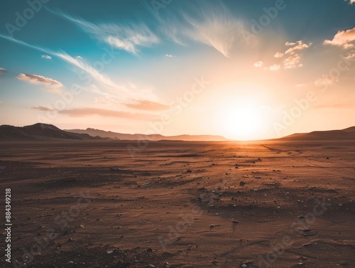 Naklejka premium A vast, red desert landscape with distant mountains and a golden sunset