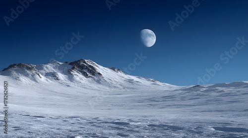 © Bussakon, Fototapeta premium A vast snow covered mountain landscape under a clear blue sky with a bright moon