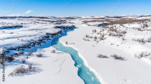 © happysunstock, Obraz premium A vast snowy landscape with a winding river and sparse vegetation under a clear blue sky.