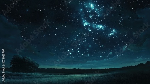 Fototapeta premium A vast, star-filled night sky over a field with a lone tree silhouette in the...