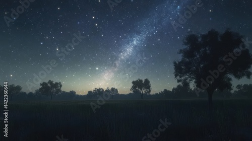 Fototapeta premium A vast, star-filled night sky over a field with trees silhouetted against the...