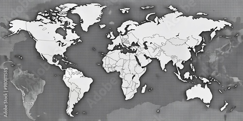 © Sirinporn, Obraz premium A vast, unmarked world map filling the frame, featuring countries and continents in muted grayscale, awaiting