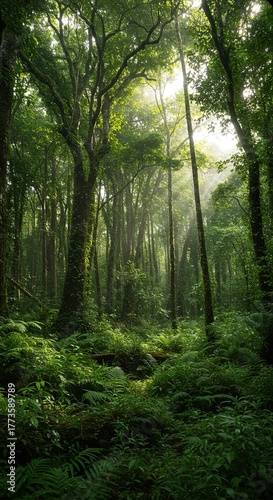 Obraz premium A vast, untouched wilderness rainforest, teeming with lush green vegetation, ancient trees, and filtered sunlight through a dense canopy ,growth ,canopy ,serene