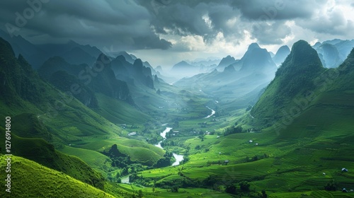 © bigkage, Fototapeta premium A vast verdant valley framed by towering misty mountains, where nature thrives under a dramatic sky.