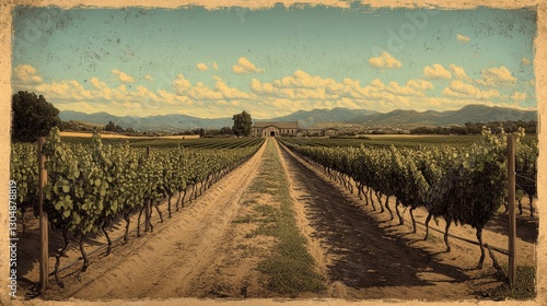 Fototapeta premium A vast vineyard stretches out in nature, rendered in a simple black and white...