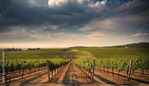 Fototapeta premium A vast vineyard with neatly aligned rows of grapevines stretching into the...