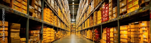 Fototapeta premium A vast warehouse aisle lined with tall shelves filled with organized boxes,...