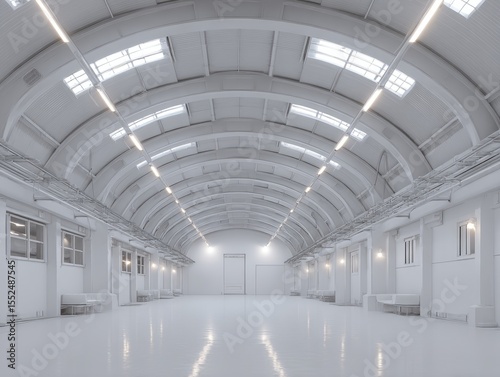© amaf, Obraz premium A vast, white, arched-ceiling industrial space with evenly spaced doorways and bright, linear lighting. The polished floor reflects the light