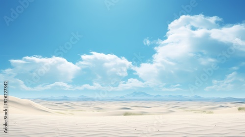 © hamzahalderad, Naklejka premium A vast, white sandy desert landscape stretches towards a range of distant mountains under a clear blue sky with fluffy clouds.