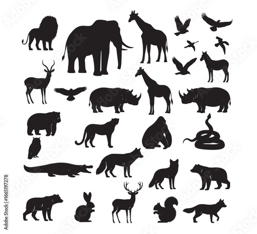 Naklejka premium A vector collection of wild and farm animal silhouettes including dogs, horses, elephants, lions, and giraffes