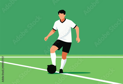 Fototapeta premium A vector illustration depicts a soccer player in a white jersey and black shorts on a green field