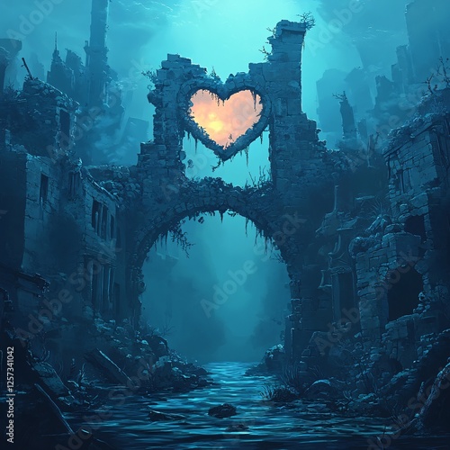 Fototapeta premium A vector illustration of a lost city submerged underwater, where ancient heart-shaped ruins still glow.
