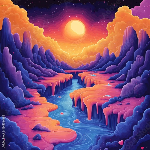 © Kanok, Fototapeta premium A vector illustration of a surrealist landscape where mountains are shaped like melting hearts.