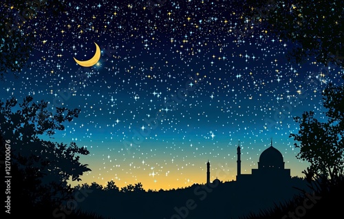 Naklejka premium A vector illustration of the night sky with stars and a crescent moon, a silhouette mosque in the bottom right corner,