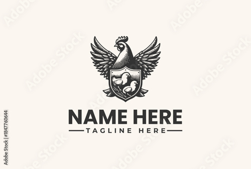 © vectorvovdesign, Obraz premium A vector logo illustration featuring a shield with a winged animal emblem and placeholder text on a beige background.