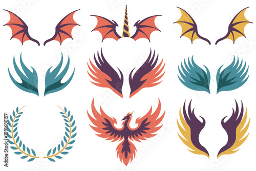 © NIKCHAN, Fototapeta premium A vector set of artistic floral wings, fire, and butterfly elements perfect for logos, tattoos, and decoration
