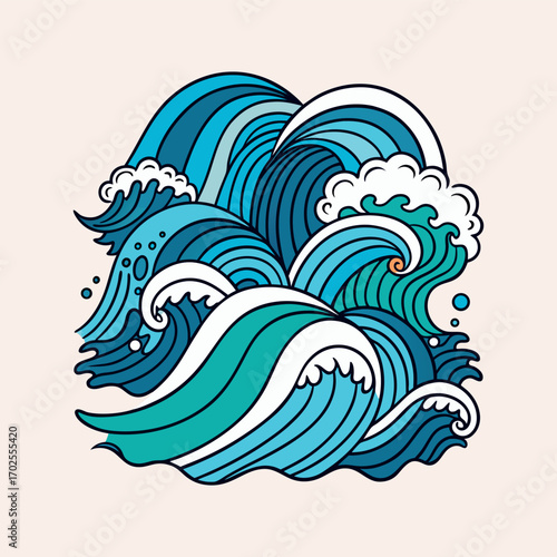 © azadhossain, Naklejka premium A vector set of doodle ocean waves. Perfect for surf designs, posters, and beach-themed graphics.