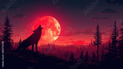 © Suradet Rakha, Naklejka premium A vector wolf howling at the moon, with a mix of bold and soft gradients.