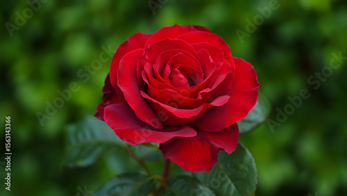 © Md kamal uddin, Naklejka premium A velvety red rose blooms in a garden against a green leafy background