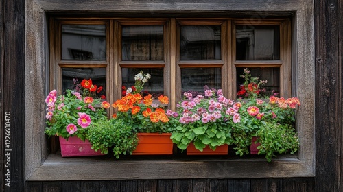 Fototapeta premium A Venetian-style window with bright flower boxes, reflecting gondolas and...
