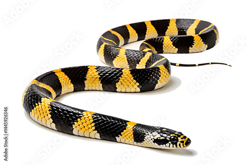 Naklejka premium A venomous black and white rattlesnake, a dangerous desert reptile, shows its...