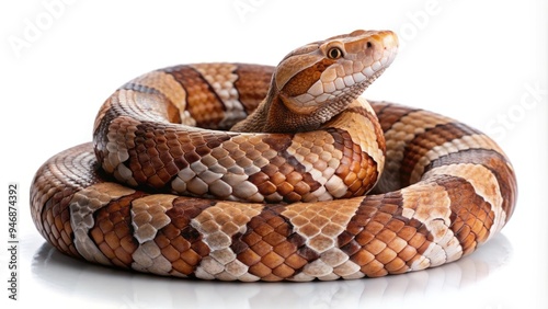 © Four888, Fototapeta premium A venomous copperhead snake, brown with hourglass-shaped markings, coils on a white background, showcasing its scaly body and sinister gaze, in sharp focus.