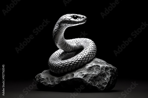 © Sanchai, Fototapeta premium A venomous snake coiled on a rock, its scales shimmering against a black background.