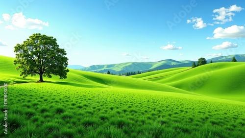 Fototapeta premium A verdant meadow bathed in sunlight, featuring a solitary, graceful tree...