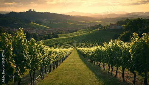 Fototapeta premium A verdant vineyard on rolling hills under a beautiful sunset