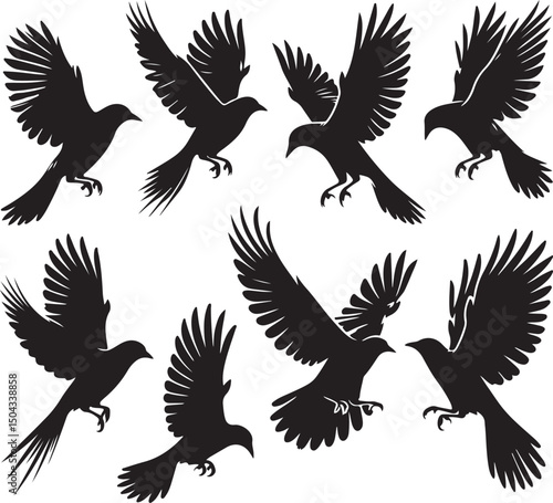 © MD NUR MIA, Fototapeta premium A versatile black silhouette vector set featuring flying eagle and bird wing illustrations perfect for nature or tattoo designs.