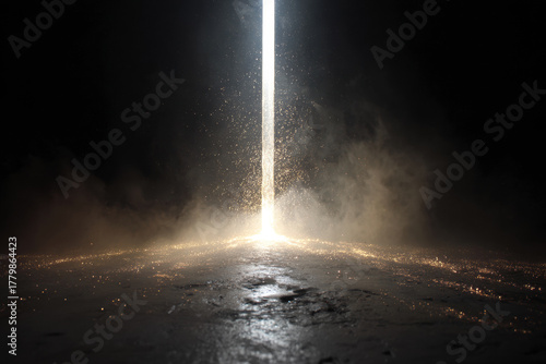 Obraz premium A vertical beam of light pierces through darkness with golden particles...