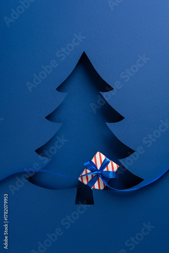 © ActionGP, Naklejka premium A vertical blue card features a layered evergreen tree cutout with a striped gift tied by a blue ribbon, evoking festive holiday vibes and seasonal greetings for Christmas and New Year celebrations