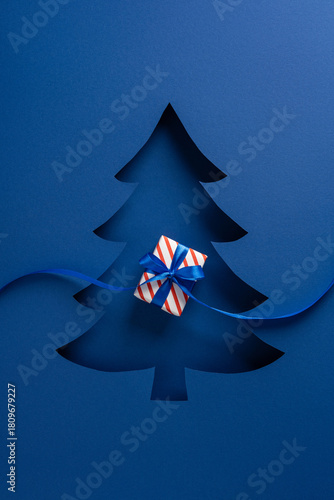 © ActionGP, Obraz premium A vertical blue greeting card features a layered Christmas tree cutout with a small striped gift box tied by a blue ribbon, illustrating festive season, gift exchange, and holiday celebration