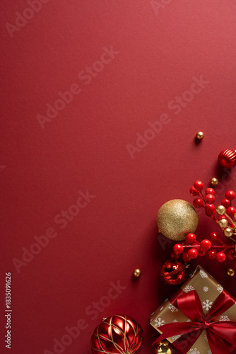 Obraz premium A vertical rich red holiday scene with glittering ornaments, gold accents, a wrapped gift and red berry clusters. Ideal for Christmas and New Year greetings