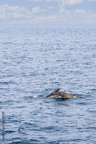 © Artem, Fototapeta premium A vertical view of the Norwegian Sea reveals a mother pilot whale and her calf, gracefully swimming in the open waters off Andenes, under a cloudy sky