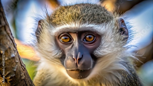 © DigitalArt Max, Fototapeta premium A vervet monkey's facial features and fur details are showcased in a close-up shot as it perches calmly in a tree branch.