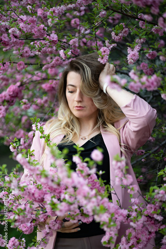 Fototapeta premium A very beautiful blonde in a pink jacket and a black blouse sensually poses standing among the flowers of cherry blossoms with her eyes closed. Goddess of nature or earth