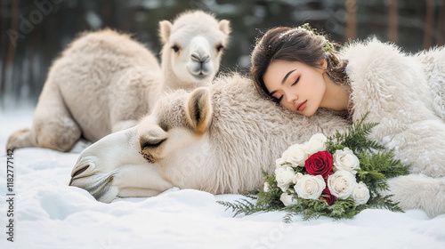 Fototapeta premium A VERY BEAUTIFUL GIRL LYING NEXT TO A WHITE CAMEL IN THE SNOW