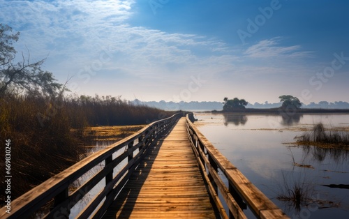 Fototapeta premium A very long boardwalk surrounded by shrubs