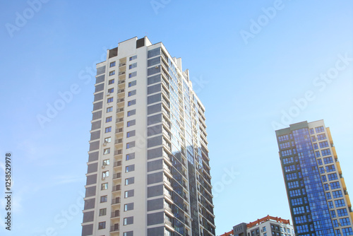 © Vera Aksionava, Obraz premium A very tall building set against a clear blue sky in the background