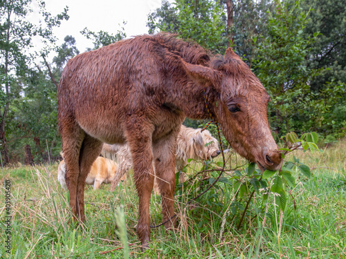Fototapeta premium A very wet brown hinny grazzing in a field near the colonial town of Villa de Leyva, in the central andean Mountains of Colombia.