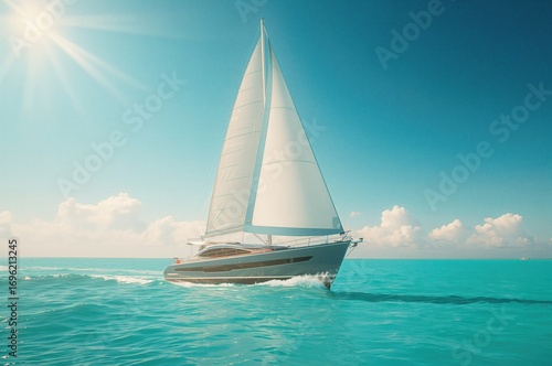 © The 2R Artificiality, Fototapeta premium A vessel sailing under a bright blue sky over the ocean