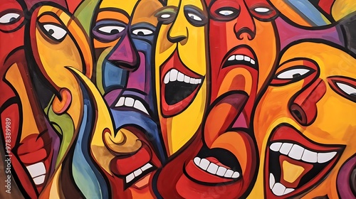Obraz premium A vibrant abstract artwork featuring expressive faces in bold colors.