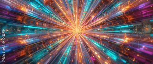 © bestimagestock, Naklejka premium A vibrant abstract background featuring dynamic, swirling lines in a spectrum of colors, interspersed with glowing lights that create a sense of depth and movement.