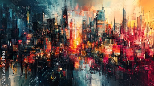 Fototapeta premium A vibrant abstract cityscape at sunset, featuring radiant colors and dynamic shapes, perfect for modern art enthusiasts.