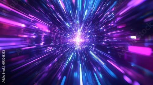 Naklejka premium A vibrant, abstract depiction of light rays speeding toward a central point, creating a sense of motion and depth with blue and purple hues.