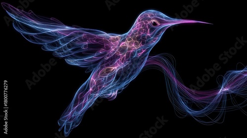 © phy, Obraz premium A vibrant, abstract hummingbird with a pink and blue hue, flying against a black background with a subtle gradient effect, creating a mesmerizing and ethereal visual experience.
