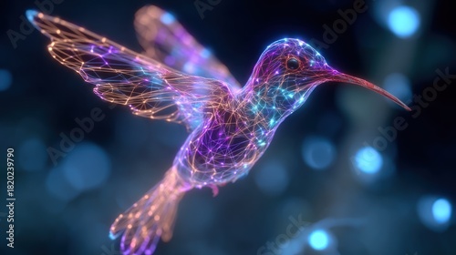 © Soklin, Fototapeta premium A vibrant, abstract hummingbird with glowing, neon lines and a blue, bokeh background, set against a dark, blurred backdrop.